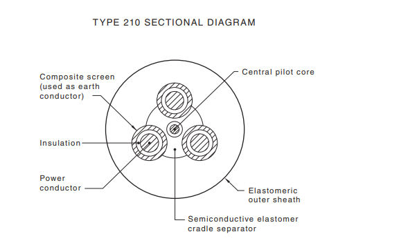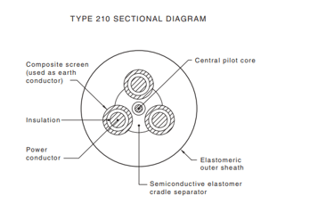 The central extensible earth-monitoring pilot represents a unique feature that sets Type 210 cables apart from conventional industrial cables. This pilot consists of a separate conductor with its own EPR covering that runs through the centre of the cable assembly. The pilot provides continuous monitoring of the cable's mechanical integrity, detecting breaks in the outer sheath or damage to the earth screen before these conditions can result in electrical faults.