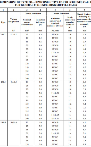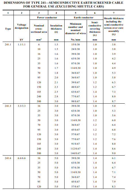 Insulation systems in Type 241 cables employ ethylene propylene rubber (EPR) technology, chosen specifically for its performance in mining environments. EPR insulation provides excellent electrical properties across the temperature range encountered in mining operations, from -25°C in refrigerated areas to +90°C near equipment and processing areas. The insulation thickness varies according to voltage rating, ranging from 1.5 mm for 1.1 kV cables to 7.6 mm for 11 kV cables, providing appropriate electrical safety margins for each application. Semiconductive screens applied over the insulation cores help control electrical stress distribution, preventing electrical failures that could result from high-voltage gradients.
