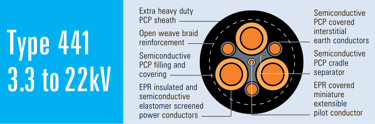 A key design element of Type 441 cables is the semiconductive cradle that supports the power cores. This feature significantly reduces the risk of damage from crushing and squashing forces. Additionally, the cables incorporate: